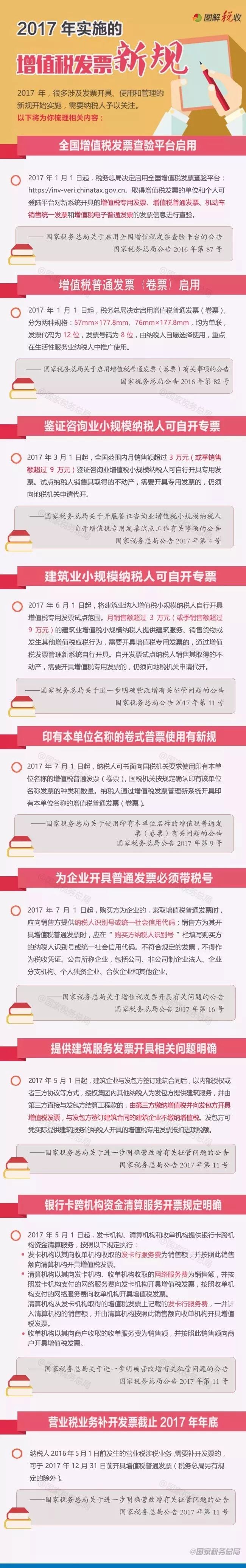 2017年,很多涉及发票开具、使用和管理的新规开始实施,需要纳税人予以关注。以下为你梳理相关内容,一图了解↓
